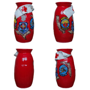 The red vessel represents my personal story and includes three military bases in which I served. The symbols are important patches, badges, and a medic armband that I wore during mass casualties, major events, and military training exercises.