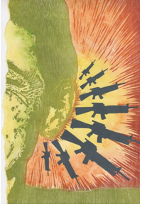 The print was created by Jennifer Ghormley and tells the story of a veteran of Operation Enduring Freedom. It is titled “The Peacekeepers,” and was created in collaboration with the Veteran Print Project, a non-profit organization that pairs veterans with artists. Their goal is two-fold: 1) Obtain and develop oral histories of a new generation of veterans and 2) to connect artists with the veterans to create prints based on the oral histories. Veteran Print Project believes that artists have a unique capability of communicating history visually. It is the goal of Veteran Print Project to assist in the development of these “Pict-Oral” histories and to display the creative energies that result from the collaboration between two iconic groups: artist and veteran.
