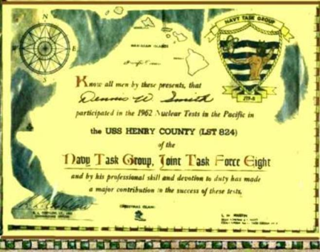 All the fun would soon be over. At the end of 1961 Russia resumed nuclear weapons testing ordered by Khrushchev. In early 1962 President John Kennedy announced we would do the same to answer the threat. The Henry County was selected to be one of the ships participating in the tests. We steamed out of Long Beach on July 12, 1962 headed for Pearl Harbor, Hawaii where we would re-supply food, fuel, and fresh water. From there we would steam to what was termed the “Johnston/Christmas Island Danger Zone” designated “Operation Dominic.” The Hawk was part of “Joint Task Force 8.” The base we would operate from would be Johnston Island, which was 823 nautical miles SSW of Hawaii. We would be steaming between Johnston and Christmas Island participating in the tests.