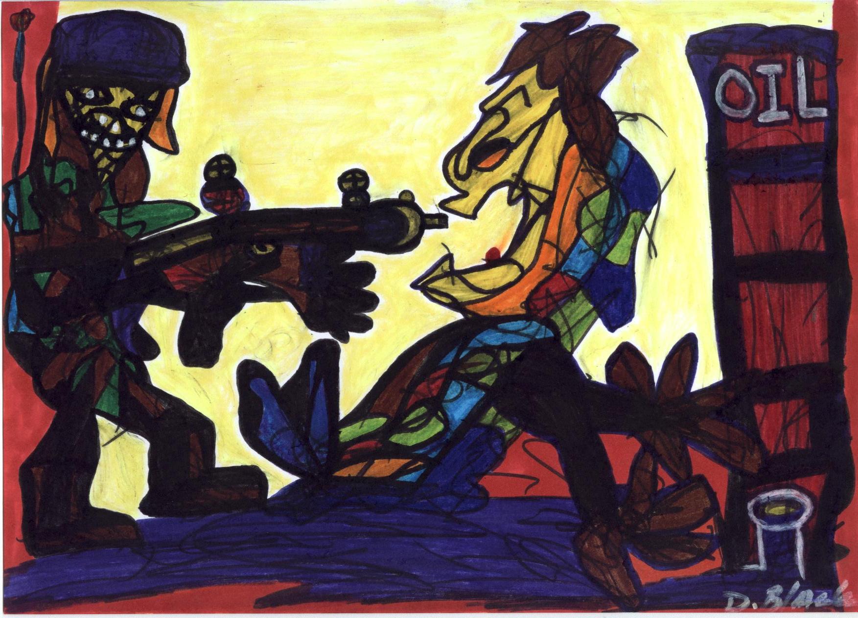 The Barrel of Diplomacy Title: The Barrel of Diplomacy Artist: Darrel Black Medium: Pen and Ink on Paper Size: 11” x 8” Description: This piece represents the military attempt to seize oil and the oil producers’ struggle to protect it Category: