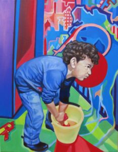 Artist Statement: I grew up in the south of England the granddaughter of war veterans on both sides of World War II and moved to New Orleans in 2017, where I met many wonderful US veterans. Veterans were my neighbors and friends and often subjects for my paintings. Learning their stories and experiences forever changed me. During 2020 I lived with my best friend who had also served in the military -her young nephew is the inspiration for this painting. As I saw him running about with a water pistol. I was reminded of the traumatic experiences he would likely endure if he follows the life path of my friend who had served. I was compelled to paint this painting after witnessing the January 6th events on television. I could feel that it was a pivotal moment in history and couldn’t stop thinking about my friend’s young nephew and what future was waiting for him.