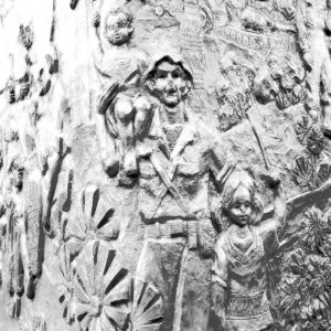 Artist Statement: “When my husband and I toured Vietnam and the site of my father’s helicopter crash (KIA 1967), we found war memorials everywhere, as you might expect – after all, they won the war. One of the most moving monuments was the one I call Fading Cinnabar. It is an enormous block of red covered with carvings of the exploits of the North Vietnamese military – of particular interest is the soldier holding his two young children – the kids could be me and my siblings. Everyone lost in this war, but mainly the children.”