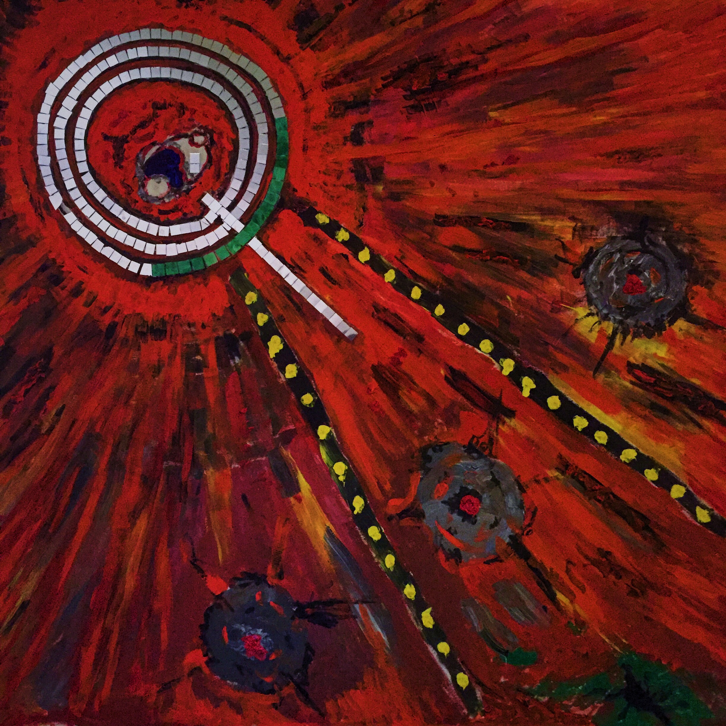 Medium: Acrylic; mixed-medium 1″x1″ mirror and jade tiles; some oil, pencil, pen, and charcoal; canvas pulled over wood frame.
