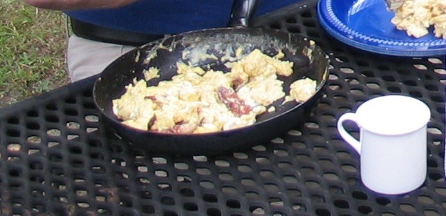 Anyone who has a problem with cholesterol or meat shouldn’t bother reading any farther—it only gets worse. And don’t try this recipe at home on the stove; it must be cooked out-of-doors. That’s imperative! First, you have to get to Ward Pound Ridge early with all the fixings to stake out a table and build a fire. Now heat the butter and bacon fat in the skillet. Break the eggs right into the skillet. Don’t worry about bits of shell getting in there; tell everyone it’s supposed to be crunchy. Add the rest of the ingredients and cook away, chatting all the while with guests about how this park is such a treasure, how you’ve been coming here for decades, how your three kids used to wade in the creek and annoy everyone with their squealing. Oops, forgot the Parmesan cheese. Oh well, who cares; it’s about camaraderie, not cheese.