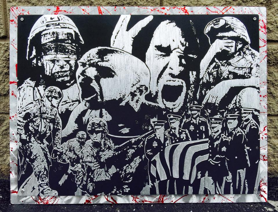 Description: I wanted outsiders to see some of the emotions that combat veterans deal with on a daily basis, from up close scenarios in combat to losing loved ones and the after effects. All images are hand engraved on black painted aluminum with only a Dremel.